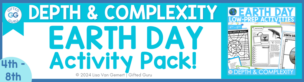 Looking for a wide selection of low-prep Earth Day activities that use the Depth & Complexity framework? This activity pack has language arts, social studies, math, and science activities, all in one great resource perfect for 4th grade through 8th grade. You'll find Earth Day persuasive writing prompts, fiction and non-fiction pieces to read, a Depth and Complexity frame to complete, a color-by-code activity, multiple Earth Day Science activities and even Earth Day math!